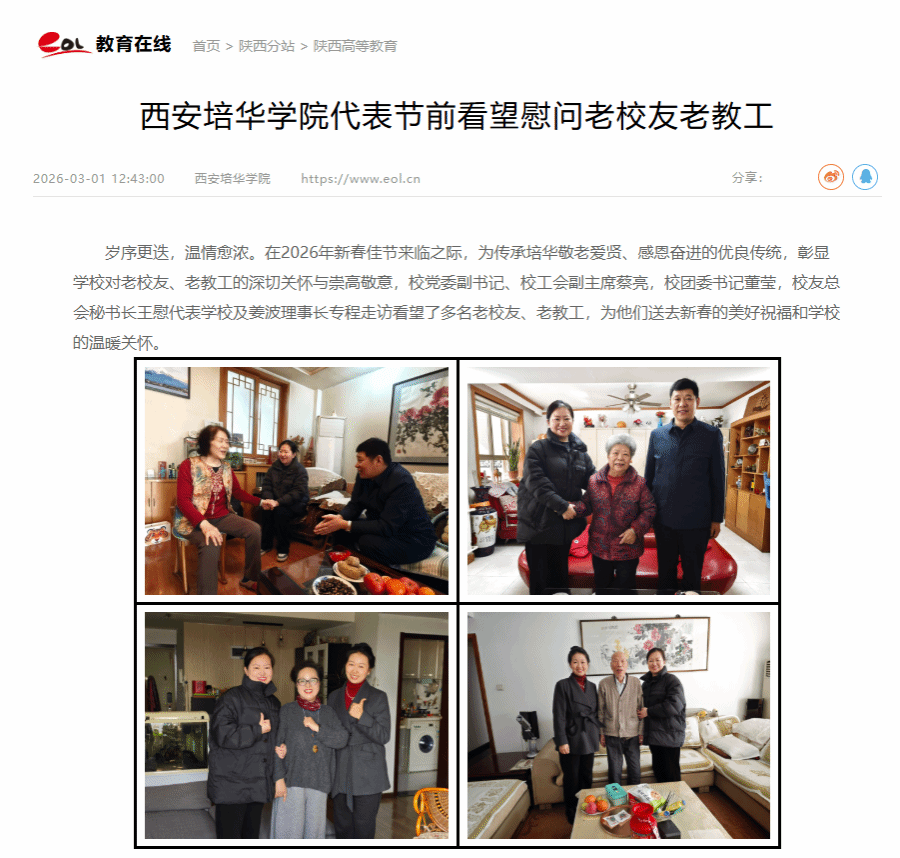 岁序更迭,温情愈浓。在2026年新春佳节来临之际,为传承培华敬老爱贤、感恩奋进的优良传统,彰显学校对老校友、老教工的深切关怀与崇高敬意,校党委副书记、校工会副主席蔡亮,校团委书记董莹,校友总会秘书长王慰代表学校及姜波理事长专程走访看望了多名老校友、老教工,为他们送去新春的美好祝福和学校的温暖关怀。