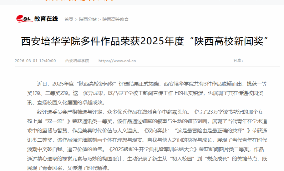 近日,2025年度“陕西高校新闻奖”评选结果正式揭晓,西安培华学院共有3件作品脱颖而出,揽获一等奖1项、二等奖2项。这一优异成果,既凸显了学校于新闻宣传工作上的扎实积淀,也展现了其在传递校园资讯、宣扬校园文化层面的卓越成效。