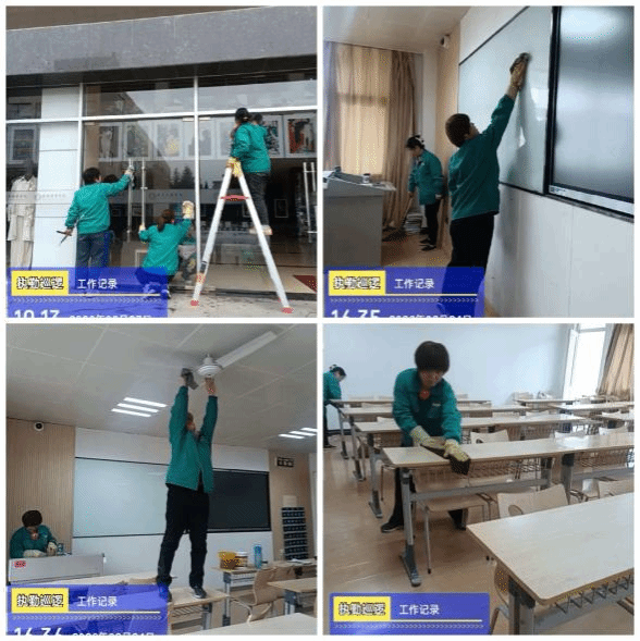 外围区域,保洁阿姨清扫道路、绿化带,清理落叶杂草及白色垃圾;教学楼内,对教室、走廊、楼梯、卫生间等进行全面清扫消毒,擦拭门窗、拖洗地面,确保环境整洁、通风良好。