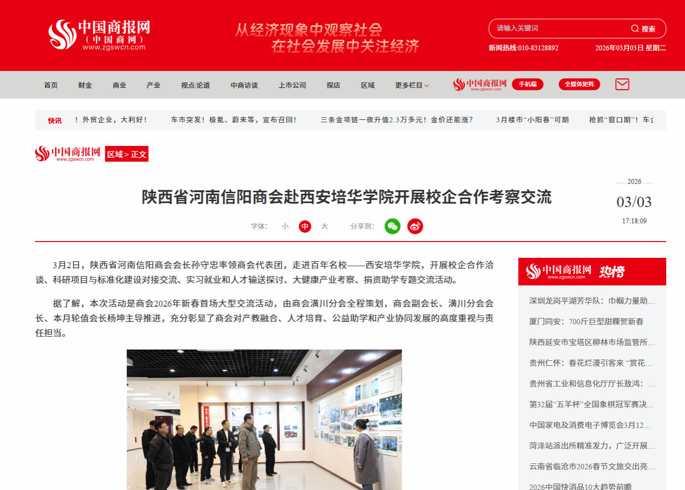 3月2日,陕西省河南信阳商会会长孙守忠率领商会代表团,走进百年名校——西安培华学院,开展校企合作洽谈、科研项目与标准化建设对接交流、实习就业和人才输送探讨、大健康产业考察、捐资助学专题交流活动。