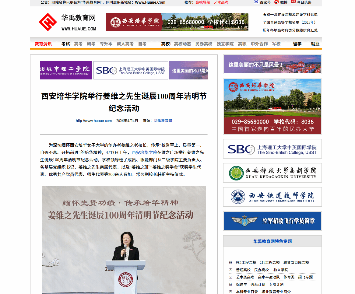 百年薪火,赓续不绝;教育报国,初心如磐。姜维之先生以一生践行 “人生的价值在于奉献” 的崇高信念,其精神早已沉淀为培华最深厚的文化基因,融入一代代培华人的血脉肌理。站在新的历史坐标上,西安培华学院始终以先生精神为指引,锚定 “强本申硕” 高质量发展航向,在民办高等教育的沃土上深耕细作、笃行不怠。全体培华人将以此次百年诞辰纪念活动为新的契机,承先生之遗志、扬奋进之风帆,在建设特色鲜明的高水平应用型民办大学的征程上勇毅前行,为中国高等教育事业的蓬勃发展注入更多培华力量、贡献更多培华智慧。