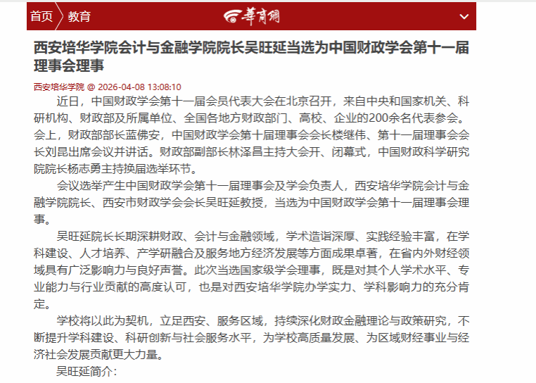 吴旺延院长长期深耕财政、会计与金融领域,学术造诣深厚、实践经验丰富,在学科建设、人才培养、产学研融合及服务地方经济发展等方面成果卓著,在省内外财经领域具有广泛影响力与良好声誉。此次当选国家级学会理事,既是对其个人学术水平、专业能力与行业贡献的高度认可,也是对西安培华学院办学实力、学科影响力的充分肯定。