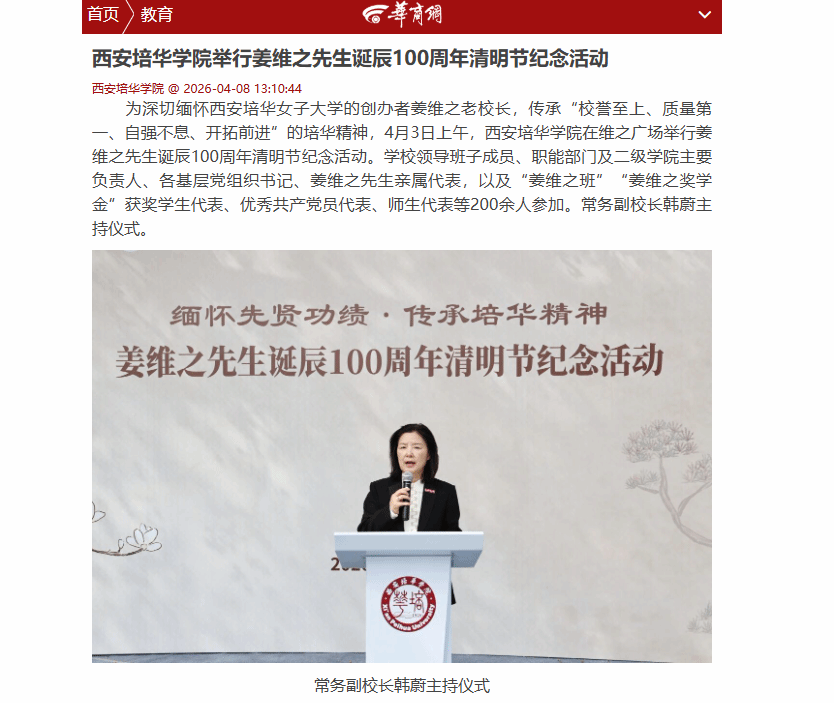 百年薪火,赓续不绝;教育报国,初心如磐。姜维之先生以一生践行 “人生的价值在于奉献” 的崇高信念,其精神早已沉淀为培华最深厚的文化基因,融入一代代培华人的血脉肌理。站在新的历史坐标上,西安培华学院始终以先生精神为指引,锚定 “强本申硕” 高质量发展航向,在民办高等教育的沃土上深耕细作、笃行不怠。全体培华人将以此次百年诞辰纪念活动为新的契机,承先生之遗志、扬奋进之风帆,在建设特色鲜明的高水平应用型民办大学的征程上勇毅前行,为中国高等教育事业的蓬勃发展注入更多培华力量、贡献更多培华智慧。