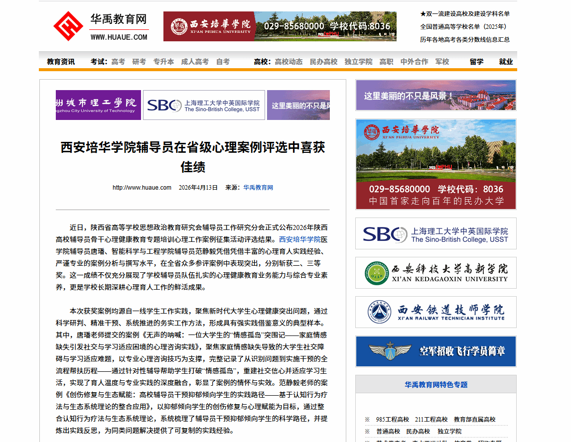 近日,陕西省高等学校思想政治教育研究会辅导员工作研究分会正式公布2026年陕西高校辅导员骨干心理健康教育专题培训心理工作案例征集活动评选结果。西安培华学院医学院辅导员唐璠、智能科学与工程学院辅导员范静毅凭借凭借丰富的心理育人实践经验、严谨专业的案例分析与撰写水平,在全省众多参评案例中表现突出,分别斩获二、三等奖。这一成绩不仅充分展现了学校辅导员队伍扎实的心理健康教育业务能力与综合专业素养,更是学校长期深耕心理育人工作的鲜活成果。