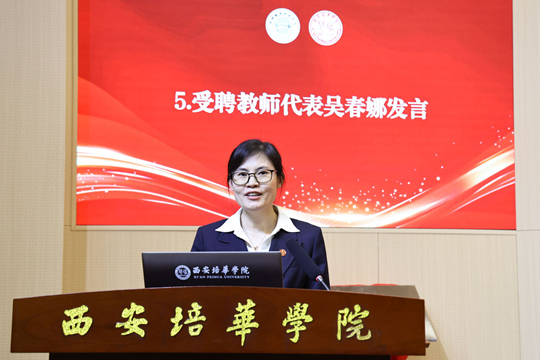 受聘教师代表吴春娜教授发言,她代表全体受聘教师,向学校的培养信任、苏州大学民办教育研究中心的关怀支持表示感谢。她表示,西部基地的揭牌为一线教师搭建了宝贵的学习交流平台,全体受聘教师将珍惜平台、虚心学习,立足实践、扎实研究,履职尽责、协同共进,以务实作风产出高质量研究成果,服务学校高质量发展与西部民办教育事业进步。