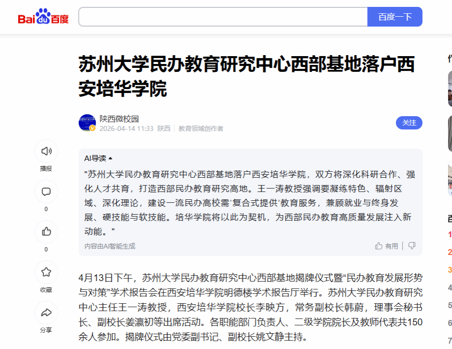 此次西部基地揭牌与学术报告会的成功举办,不仅为学校搭建了更高层次的学术研究平台,更为服务西部民办教育高质量发展注入了新的智库动能。西安培华学院将以基地为纽带,依托苏州大学民办教育研究中心的学术优势,整合校内外研究资源,聚焦西部民办教育改革发展的重点难点问题,扎实开展政策研究、案例分析和成果转化,全力打造立足西部、服务全国、特色鲜明的高水平民办教育研究高地,将以“强本申硕”战略为牵引,把基地建设与高质量发展深度融合,为我国民办教育事业的改革创新和持续繁荣贡献培华智慧与力量。