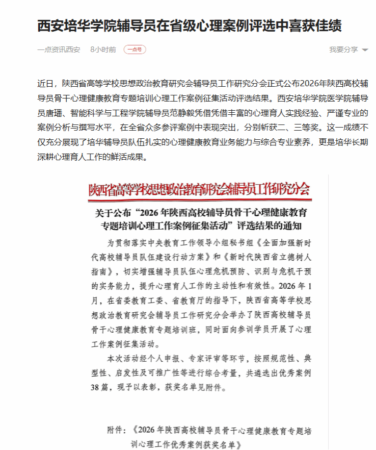 近日,陕西省高等学校思想政治教育研究会辅导员工作研究分会正式公布2026年陕西高校辅导员骨干心理健康教育专题培训心理工作案例征集活动评选结果。西安培华学院医学院辅导员唐璠、智能科学与工程学院辅导员范静毅凭借凭借丰富的心理育人实践经验、严谨专业的案例分析与撰写水平,在全省众多参评案例中表现突出,分别斩获二、三等奖。这一成绩不仅充分展现了学校辅导员队伍扎实的心理健康教育业务能力与综合专业素养,更是学校长期深耕心理育人工作的鲜活成果。