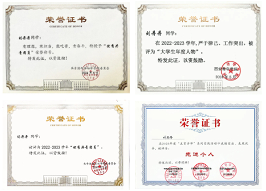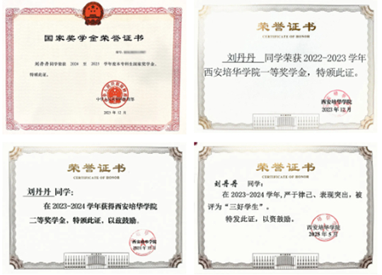 这个成绩不是突击出来的。从大一到大四,刘丹丹的奖学金证书从未间断——校级一等奖学金、二等奖学金、秋季外语奖学金,直到2025年拿下国家奖学金。