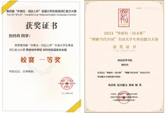 从那以后,同老师不断鼓励她——参加大英赛、参加“外研社·国才杯”比赛、考四六级……在老师的耐心引导和自身的不懈努力下,刘丹丹一步步突破自我。