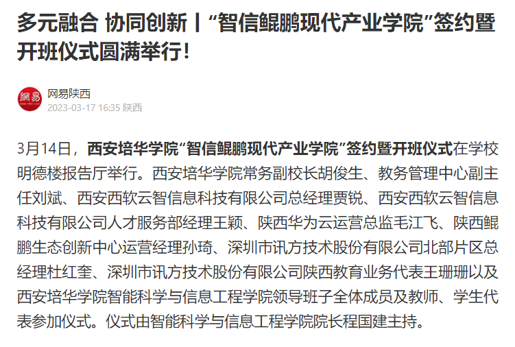 3月14日,西安培华学院“智信鲲鹏现代产业学院”签约暨开班仪式在学校明德楼报告厅举行。西安培华学院常务副校长胡俊生、教务管理中心副主任刘斌、西安西软云智信息科技有限公司总经理贾锐、西安西软云智信息科技有限公司人才服务部经理王颖、陕西华为云运营总监毛江飞、陕西鲲鹏生态创新中心运营经理孙琦、深圳市讯方技术股份有限公司北部片区总经理杜红奎、深圳市讯方技术股份有限公司陕西教育业务代表王珊珊以及西安培华学院智能科学与信息工程学院领导班子全体成员及教师、学生代表参加仪式。仪式由智能科学与信息工程学院院长程国建主持。