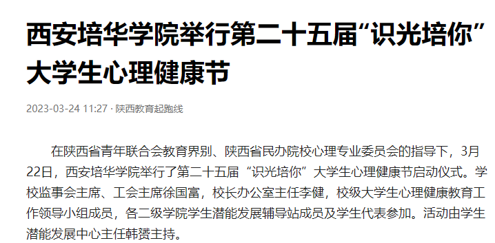 在陕西省青年联合会教育界别、陕西省民办院校心理专业委员会的指导下,3月22日,西安培华学院举行了第二十五届“识光培你”大学生心理健康节启动仪式。学校监事会主席、工会主席徐国富,校长办公室主任李健,校级大学生心理健康教育工作领导小组成员,各二级学院学生潜能发展辅导站成员及学生代表参加。活动由学生潜能发展中心主任韩赟主持。