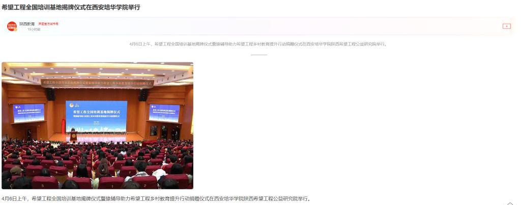 4月6日上午,希望工程全国培训基地揭牌仪式暨猿辅导助力希望工程乡村教育提升行动捐赠仪式在西安培华学院陕西希望工程公益研究院举行。