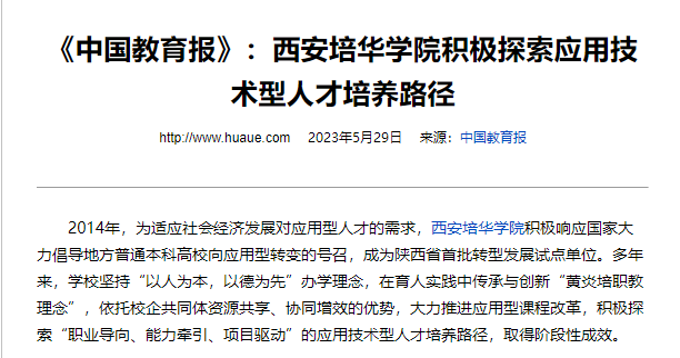 2014年,为适应社会经济发展对应用型人才的需求,西安培华学院积极响应国家大力倡导地方普通本科高校向应用型转变的号召,成为陕西省首批转型发展试点单位。多年来,学校坚持“以人为本,以德为先”办学理念,在育人实践中传承与创新“黄炎培职教理念”,依托校企共同体资源共享、协同增效的优势,大力推进应用型课程改革,积极探索“职业导向、能力牵引、项目驱动”的应用技术型人才培养路径,取得阶段性成效。