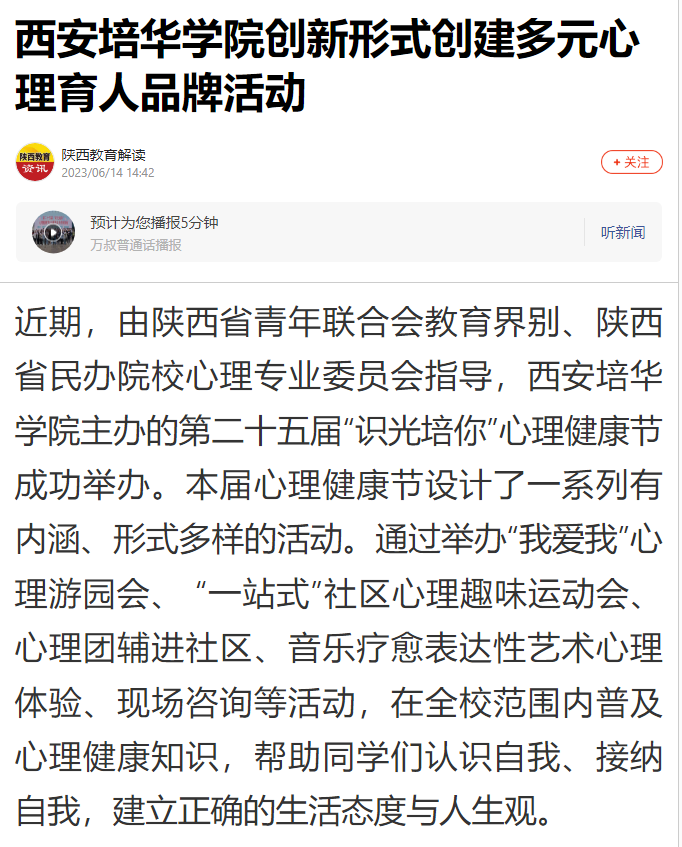 该校学生潜能发展中心主任韩赟表示,心理健康教育作为落实立德树人根本任务的重要抓手,西安培华学院坚持将育心和育人相结合,以生涯规划为引领,促进学生心理健康,助力大学生身心健康发展为目标,进一步提升大学生心理健康工作的针对性和有效性,持续多样化、立体化、个性化探索心理育人新模式和新方法。