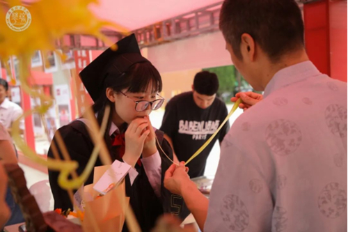 2023年,正值学校建校95周年,场馆外,学校特别搭建了意义深远的“95周年历史长河”景观墙,设置了励志古诗词的道旗与路标,与“平步青云”“掷地有声”“功不‘糖’捐”“事事如意”的毕业游戏互动区遥相呼应,毕业生们手持“致青春”“前程似锦”“乘风破浪”“未来可期”等主题元素的手牌纷纷合影留念。