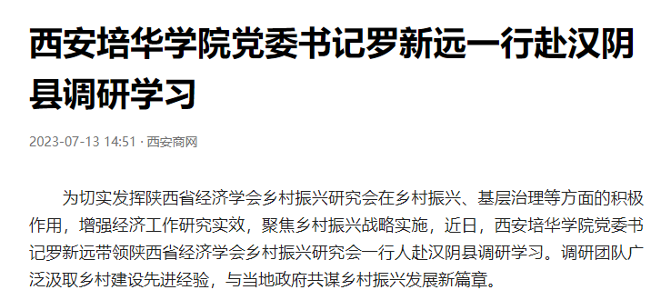 为切实发挥陕西省经济学会乡村振兴研究会在乡村振兴、基层治理等方面的积极作用,增强经济工作研究实效,聚焦乡村振兴战略实施,近日,西安培华学院党委书记罗新远带领陕西省经济学会乡村振兴研究会一行人赴汉阴县调研学习。调研团队广泛汲取乡村建设先进经验,与当地政府共谋乡村振兴发展新篇章。