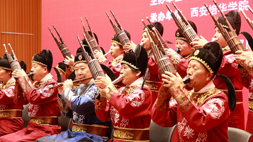 第二阶段揭牌仪式正式开始前,西安都城隍庙鼓乐社身着华服,以高超的演奏技巧为现场师生带来一首经典曲目《步步娇》,让人们沉浸在典雅大气的鼓乐之中,感受灵魂的洗礼与精神的升华,引得现场掌声阵阵。