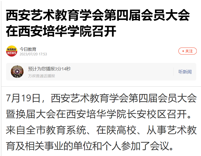 7月19日,西安艺术教育学会第四届会员大会暨换届大会在西安培华学院长安校区召开。来自全市教育系统、在陕高校、从事艺术教育及相关事业的单位和个人参加了会议。