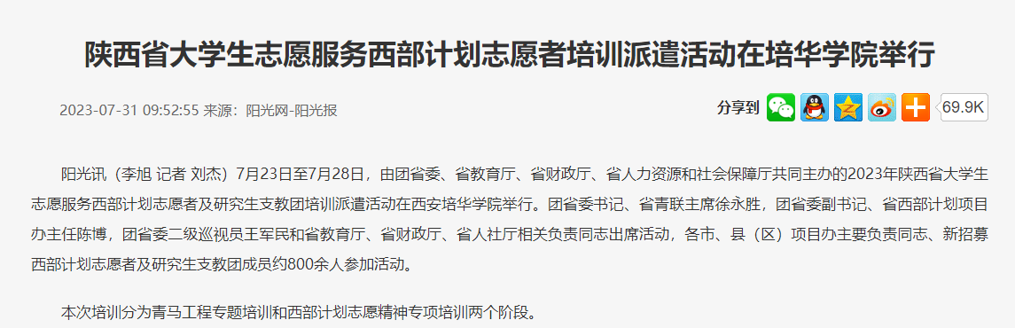 阳光讯(李旭 记者 刘杰)7月23日至7月28日,由团省委、省教育厅、省财政厅、省人力资源和社会保障厅共同主办的2023年陕西省大学生志愿服务西部计划志愿者及研究生支教团培训派遣活动在西安培华学院举行。团省委书记、省青联主席徐永胜,团省委副书记、省西部计划项目办主任陈博,团省委二级巡视员王军民和省教育厅、省财政厅、省人社厅相关负责同志出席活动,各市、县(区)项目办主要负责同志、新招募西部计划志愿者及研究生支教团成员约800余人参加活动。