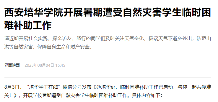 8月3日,“培华学工在线”微信公号发布《@培华er,临时困难补助工作已启动,与你一起共渡难关!》,开展学校暑期遭受自然灾害学生临时困难补助工作。具体内容如下: