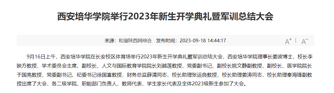 9月16日上午,西安培华学院在长安校区体育场举行2023年新生开学典礼暨军训总结大会,西安培华学院理事长姜波博士,校长李映方教授,学术委员会主席、副校长、人文与国际教育学院院长刘越莲教授,党委副书记、副校长姚文静副教授,副校长、医学院院长于国亮教授,党委副书记、纪委书记徐国富教授,财务总监薛清同志,校长助理张运良教授,校长助理姜涛同志,校长助理秦海锋副教授出席了大会,各二级学院、职能部门负责人,教师代表,学生家长代表及全体2023级新生参加了大会。