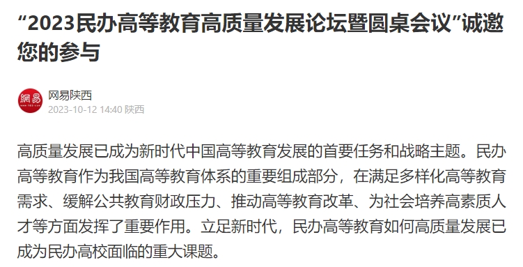 为推动民办高等教育高质量发展,陕西省高等教育学会、陕西省民办教育协会、西安培华学院将于10月22日联合举办“2023民办高等教育高质量发展论坛暨圆桌会议”(以下简称“论坛”)。在培华建校95周年之际,通过本次论坛,旨在搭建一个学术交流平台,汇聚高等教育专家学者、民办高校负责人、行业企业专家等,分享办学经验、探讨发展路径,形成提升民办高等教育高质量发展的策略。我们诚挚邀请民办高校董事长(理事长)、校长,高等教育专家学者出席此次盛会。您的出席将为本次论坛增添更多的精彩与深度,为与会嘉宾带来全新的启示和思考。
