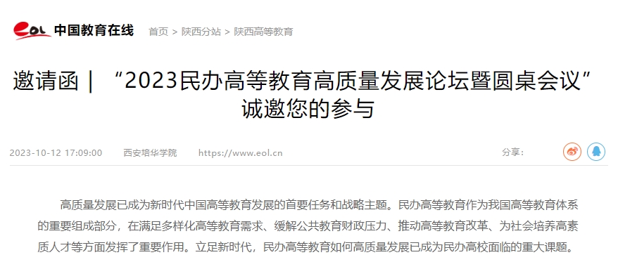 为推动民办高等教育高质量发展,陕西省高等教育学会、陕西省民办教育协会、西安培华学院将于10月22日联合举办“2023民办高等教育高质量发展论坛暨圆桌会议”(以下简称“论坛”)。在培华建校95周年之际,通过本次论坛,旨在搭建一个学术交流平台,汇聚高等教育专家学者、民办高校负责人、行业企业专家等,分享办学经验、探讨发展路径,形成提升民办高等教育高质量发展的策略。我们诚挚邀请民办高校董事长(理事长)、校长,高等教育专家学者出席此次盛会。您的出席将为本次论坛增添更多的精彩与深度,为与会嘉宾带来全新的启示和思考。