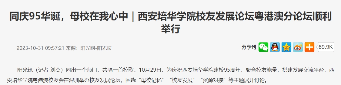 阳光讯(记者 刘杰)同出一个师门,共唱一首校歌。10月29日,为庆祝西安培华学院建校95周年,聚合校友能量,搭建发展交流平台,西安培华学院粤港澳校友会在深圳举办校友发展论坛,围绕“母校记忆”“校友发展”“资源对接”等主题展开讨论。