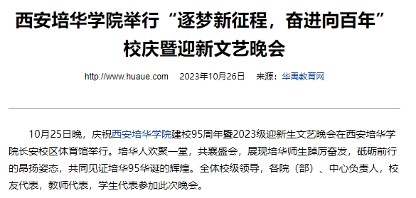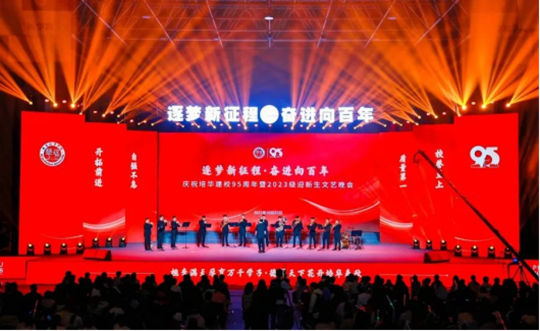 10月25日晚,庆祝西安培华学院建校95周年暨2023级迎新生文艺晚会在西安培华学院长安校区体育馆举行。培华人欢聚一堂,共襄盛会,展现培华师生踔厉奋发,砥砺前行的昂扬姿态,共同见证培华95华诞的辉煌。全体校级领导,各院(部)、中心负责人,校友代表,教师代表,学生代表参加此次晚会。