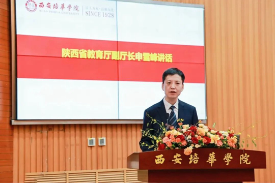 陕西省委教育工委委员、陕西省教育厅副厅长申雪峰代表陕西省委教育工委、陕西省教育厅向培华建校95周年表示热烈的祝贺。他指出,西安培华学院是陕西民办高等教育的典型代表之一,多年以来强化内涵建设,锐意开拓进取,在学校党的建设,办学机制改革,教育教学改革,办学条件改善,品牌专业建设等方面创造了许多经验。在我国民办高等教育发展迈入高质量发展新机遇的背景下,对陕西民办高等 学校提出了三点希望:一是要全面贯彻党的教育方针,要牢牢抓住培养社会主义建设者和接班人的总体目标,坚守教育公益性,办人民满意的教育。二是持续提高教育教学质量,要落实教学工作在学校各项工作中的中心地位,加大教学投入,强化教学基本建设,在学科专业建设、教学成果培育、学生实习实训、校企合作育人等方面出实招、求实效,坚持质量立校、特色强校,在激烈的校际竞争中脱颖而出、勇立潮头。三是要注重民办高等教育理论和实践研究。进一步健全民办高等教育研究智库,加强理论研究与实践探索,总结民办高等教育发展的成果经验,发掘其中的理论和社会价值,既向国内外优秀的高校学习,也注重梳理总结本校改革发展中的经验教训,努力构建有中国特色的民办高等教育理论体系,引领民办高等教育高质量发展。