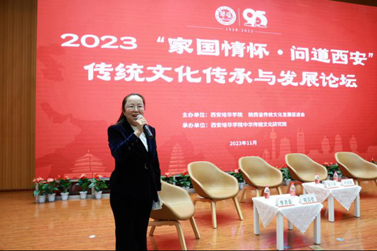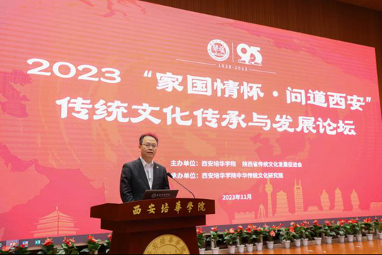 为弘扬家国情怀,传承中华传统文化,振兴文化产业,为西安经济高质量发展建言献策、蓄势赋能,11月6日,由西安培华学院、陕西省传统文化发展促进会联合举办的2023“家国情怀·问道西安”传统文化发展论坛在西安培华学院图书馆报告厅隆重开幕。开幕式由西安培华学院校长李映方主持。