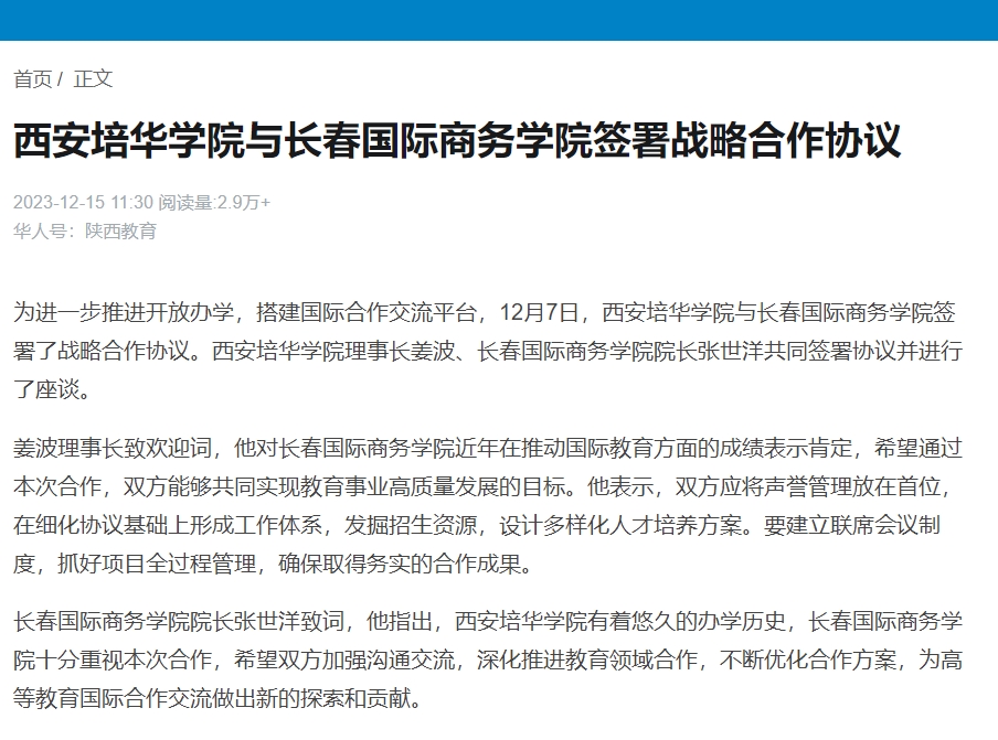 为进一步推进开放办学,搭建国际合作交流平台,12月7日,西安培华学院与长春国际商务学院签署了战略合作协议。西安培华学院理事长姜波、长春国际商务学院院长张世洋共同签署协议并进行了座谈。