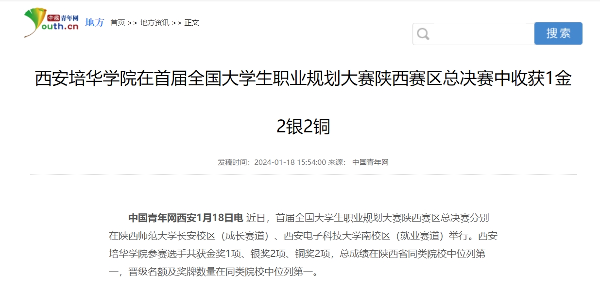 本次大赛以“筑梦青春志在四方 规划启航职引未来”为主题。陕西省93所高校超39.5万名学生参与了此次大赛,最终有200名选手入围陕西赛区总决赛。决赛分为“现场陈述”“评委提问(综合面试)”“天降(实习)offer”等多个环节,经过角逐,西安培华学院分别获得成长赛道高教组决赛金银奖、就业赛道高职组决赛银奖、就业赛道高教组决赛铜奖。