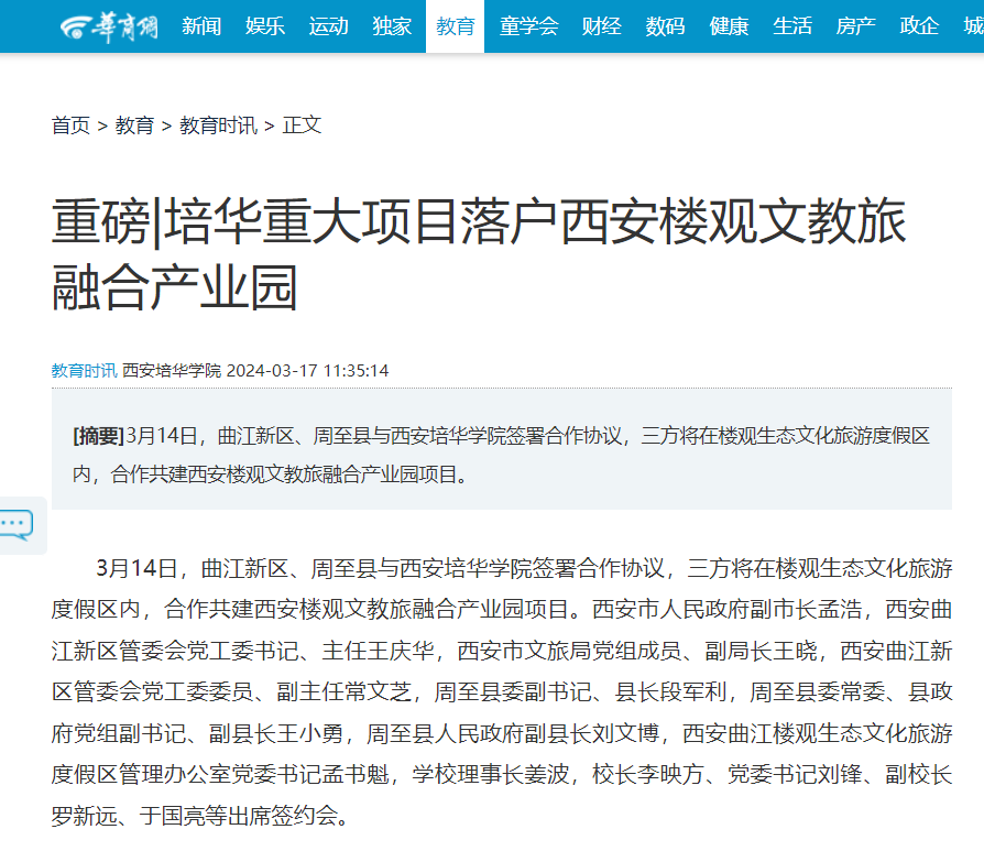 3月14日,曲江新区、周至县与西安培华学院签署合作协议,三方将在楼观生态文化旅游度假区内,合作共建西安楼观文教旅融合产业园项目。西安市人民政府副市长孟浩,西安曲江新区管委会党工委书记、主任王庆华,西安市文旅局党组成员、副局长王晓,西安曲江新区管委会党工委委员、副主任常文芝,周至县委副书记、县长段军利,周至县委常委、县政府党组副书记、副县长王小勇,周至县人民政府副县长刘文博,西安曲江楼观生态文化旅游度假区管理办公室党委书记孟书魁,学校理事长姜波,校长李映方、党委书记刘锋、副校长罗新远、于国亮等出席签约会。