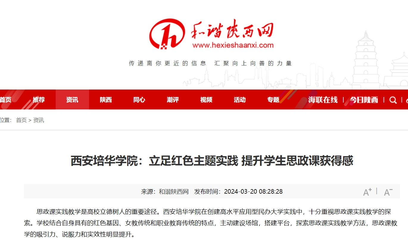 思政课实践教学是高校立德树人的重要途径。西安培华学院在创建高水平应用型民办大学实践中,十分重视思政课实践教学的探索。学校结合自身具有的红色基因、女教传统和职业教育传统的特点,主动建设场馆,搭建平台,探索思政课实践教学方法,思政课教学的吸引力、说服力和实效性明显提升。