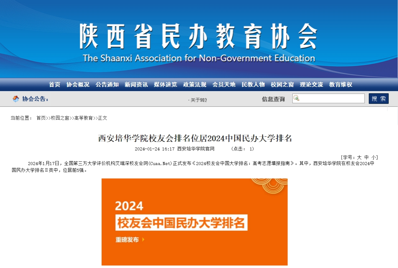2024年1月17日,全国第三方大学评价机构艾瑞深校友会网(Cuaa.Net)正式发布《2024校友会中国大学排名:高考志愿填报指南》。其中,西安培华学院在校友会2024中国民办大学排名Ⅱ类中,位居前5强。