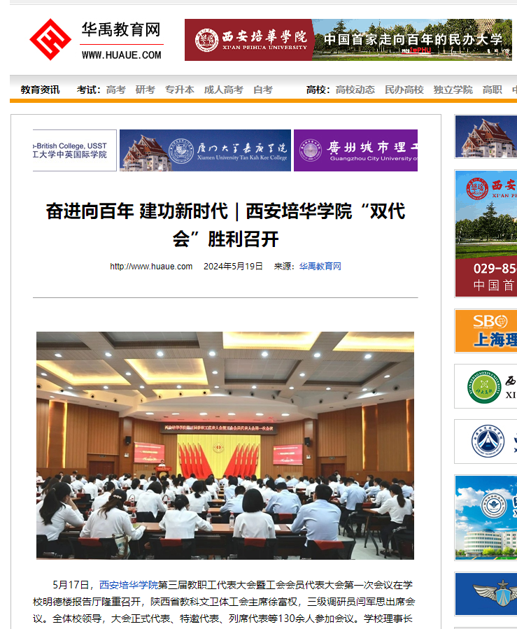 5月17日,西安培华学院第三届教职工代表大会暨工会会员代表大会第一次会议在学校明德楼报告厅隆重召开,陕西省教科文卫体工会主席徐富权,三级调研员闫军思出席会议。全体校领导,大会正式代表、特邀代表、列席代表等130余人参加会议。学校理事长姜波致开幕词,校长李映方作学校工作报告,监事会主席、工会主席徐国富作工会工作报告,党委书记刘锋总结讲话。大会执行主席徐国富主持开幕会。