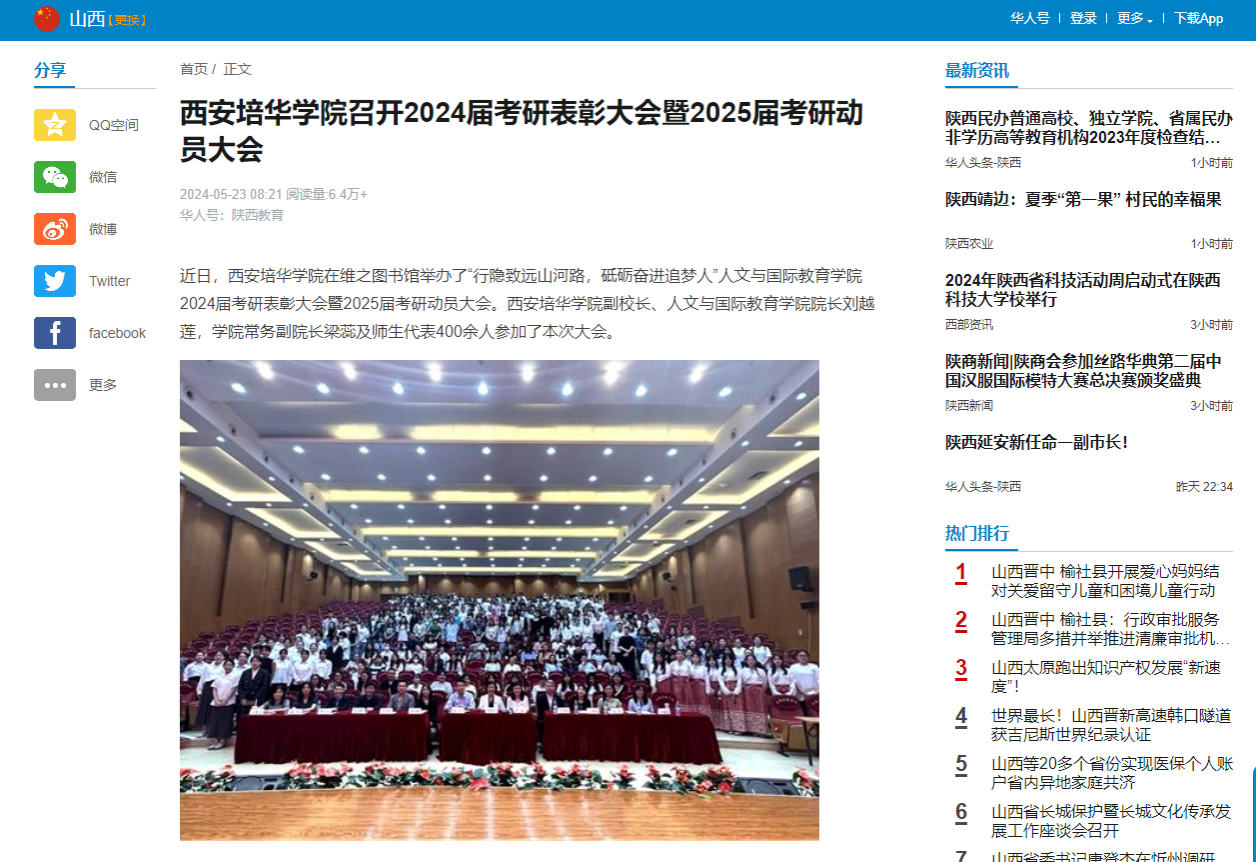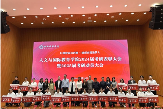 近日,西安培华学院在维之图书馆举办了“行隐致远山河路,砥砺奋进追梦人”人文与国际教育学院2024届考研表彰大会暨2025届考研动员大会。西安培华学院副校长、人文与国际教育学院院长刘越莲,学院常务副院长梁蕊及师生代表400余人参加了本次大会。