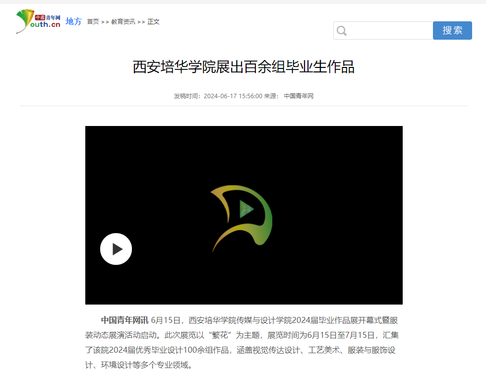 中国青年网讯6月15日,西安培华学院传媒与设计学院2024届毕业作品展开幕式暨服装动态展演活动启动。此次展览以“繁花”为主题,展览时间为6月15日至7月15日,汇集了该院2024届优秀毕业设计100余组作品,涵盖视觉传达设计、工艺美术、服装与服饰设计、环境设计等多个专业领域。