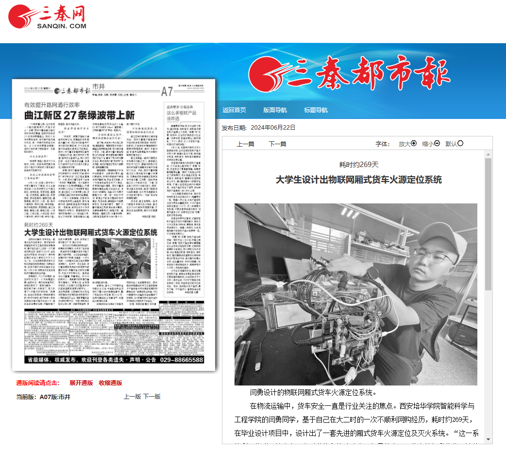在物流运输中,货车安全一直是行业关注的焦点。西安培华学院智能科学与工程学院的闫勇同学,基于自己在大二时的一次不顺利网购经历,耗时约269天,在毕业设计项目中,设计出了一套先进的厢式货车火源定位及灭火系统。“这一系统利用物联网技术实现实时监控和快速响应,如果能应用,将有效提升货物运输的安全性。”6月20日,闫勇在实验室自信地讲述着他的毕业作品。