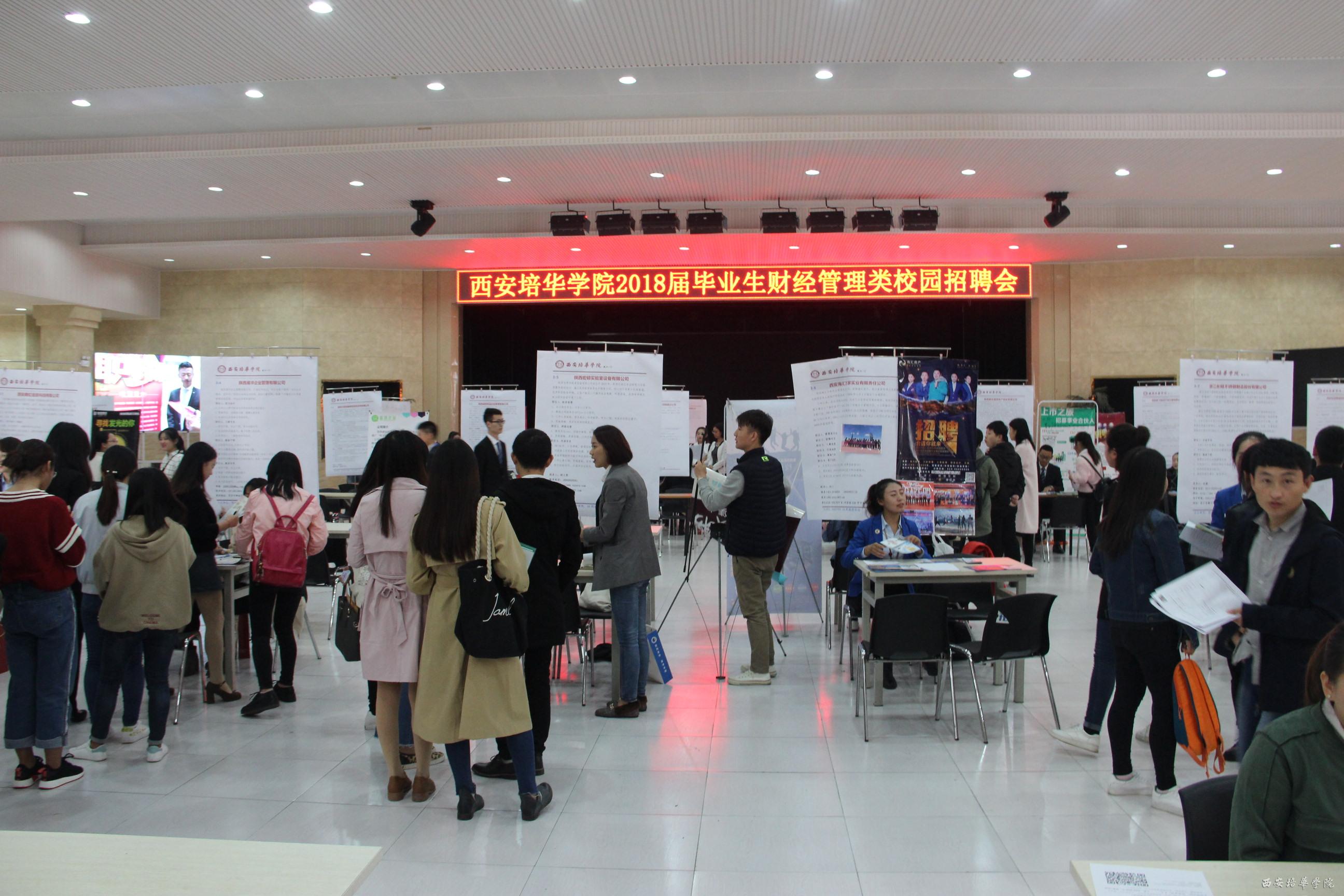近日,我校首场财经管理类专场招聘会在长安校区大学生活动中心二楼举行,陕西西财企业管理服务有限公司、陕西银杰金融信息服务有限公司、西安智诚财务管理有限公司等70余家单位来校招揽人才。据统计,此次招聘会共为毕业生提供了3000多个岗位,来自我校会计学院、商学院以及省内外其他高校毕业生参加了此次招聘会。