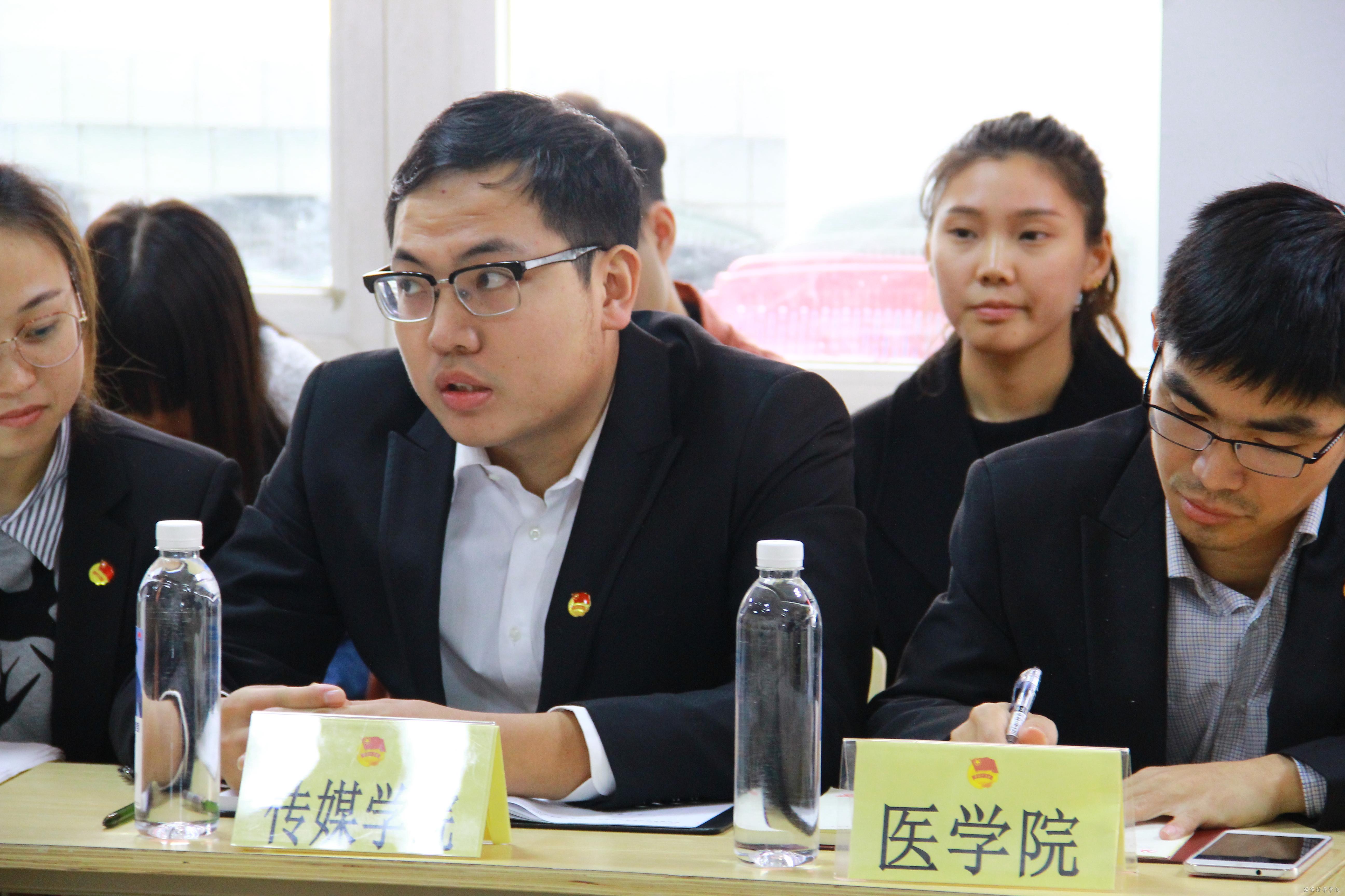 其次由传媒学院分团委书记田耕毓发言,他讲到:刚才听了雷梦书记学习贯彻党的十九大精神的解读,我也想具体谈一谈从严治党,三严三实。我是传媒学院团委书记,但是我并没有把自己当成一个干部而,而是一名普通的辅导员,只是学校给我了这个平台,让我更好的为学生服务,为学校做贡献。积极团结同学,以党章为根本遵循,把党的政治建设放在首位。还有要求各位团学干部,不要官僚主义,同学主动贴近你,以你为榜样,向你靠近,才是一个合格的学生干部,才能体现你的价值。让我们一同携手,为培华的明天而努力,奋斗。