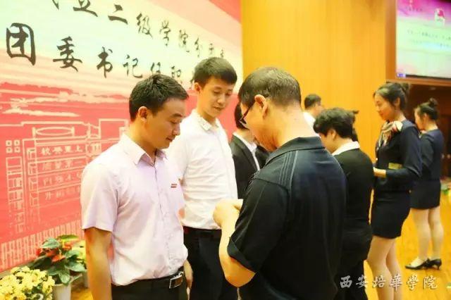 大会第三项由党委工作部部长陈玲,学工部副部长徐莹,纪委副书记吉小平为10名二级学院新任团干部佩戴团徽,同时党委副书记、副校长姚文静为10个新成立二级学院分团委授旗。