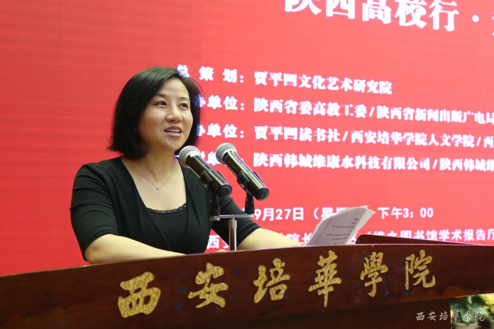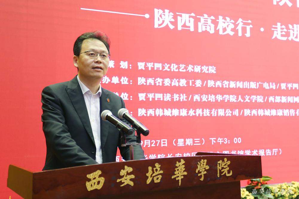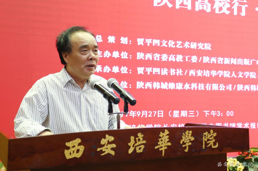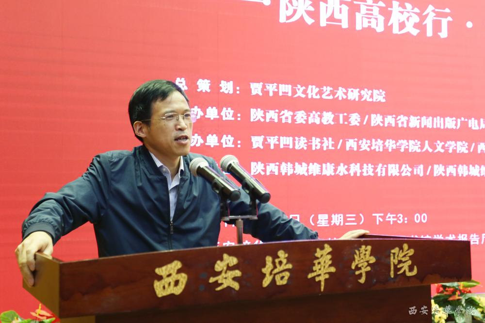 西安培华学院理事长姜波应邀致欢迎词,他表示,举办这样的活动,为学生提供与文学专家面对面交流的机会,非常难得,希望学子们向三位文化大家学习,多读书,读好书,在知识的海洋中汲取营养,得到身心灵的全面提升。中共陕西省委高教工委副书记李智军在讲话中表示,培华学院重视提升学生的文化素养,以文化滋养学生的心灵,在全省堪称典范。陕西省新闻出版广电局公共事业处处长申小毅在讲话中表示,希望学校师生发挥示范引领作用,养成爱读书的好习惯,用实际行动影响身边的人。陕西省人民出版社编审、“陕西文化三人传”策划编辑张孔明在讲话强调了活动举办的意义,并向支持活动举办的单位表示了感谢,希望将全民阅读公益活动常态化进行下去。