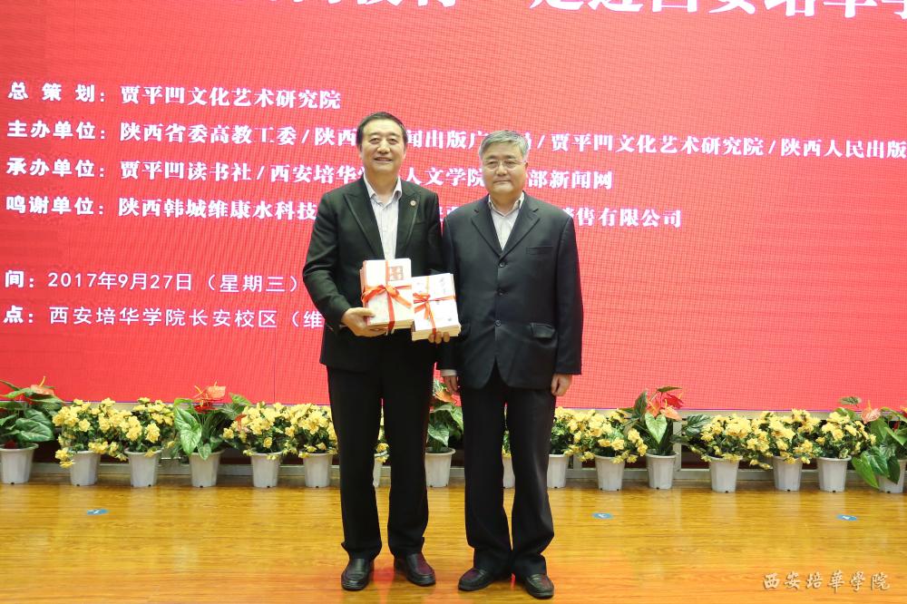 中共陕西省委高教工委副书记李智军、陕西省新闻出版广电局公共事业处处长申小毅向我校姜波理事长颁发了贾平凹艺术研究院“读书大使”奖杯和证书