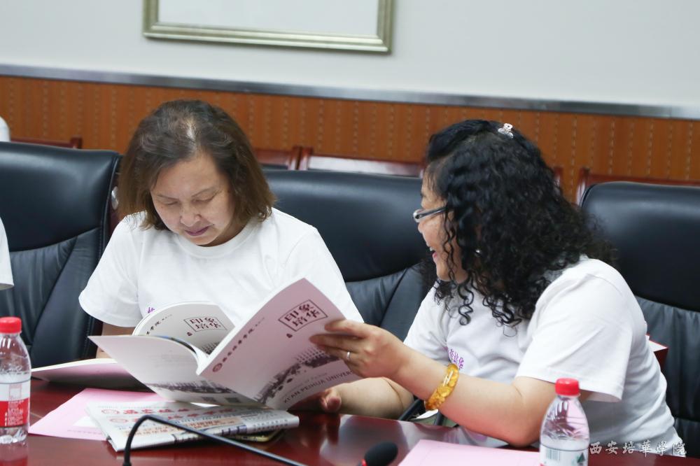 在明德楼第一会议室学姐们仔细的翻看母校的画册,感慨:“我们的培华简直太漂亮了”