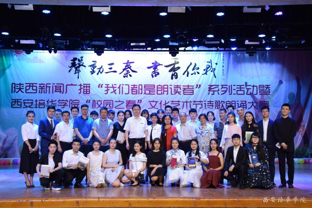 时代筑梦,青春担当。6月1日晚,由陕西广播电视台新闻广播、陕西省作家协会创联部、西安培华学院联合主办的"我们都是朗读者"系列活动暨西安培华学院"校园之春"文化艺术节诗歌朗诵大赛在我校大学生活动中心举办。西安培华学院理事长姜波博士,陕西新闻广播总监付银安,陕西省作家协会创联部副主任迟洪国,西安培华学院副校长兼党委副书记姚文静,作家唐卡,作家张也,作家张鹰,西安培华学院各院系领导以及陕西新闻广播多位主持人和近千名师生等出席活动。