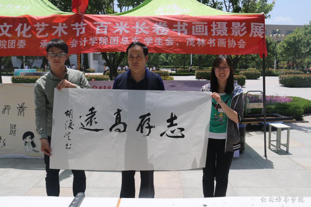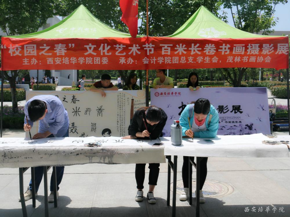 5月9日上午,由西安培华学院校团委主办,会计学院团总支、学生会、茂林书画协会承办的 “校园之春”文化艺术节——“百米长卷”书画摄影展于综合楼西广场拉开帷幕。本次参展作品包括绘画、书法、摄影三大类,所有作品围绕“我眼中的世界”为主题开展,旨在展示大学校园文化及大学生独特的创意与激情,丰富学校的文化艺术氛围,激发同学们对生活的热爱。此次活动共分为两个部分进行,一是书法、摄影作品展览,展出的作品均由会计学院精挑细选,作品总量达300余幅;二是书法作品现场书写活动,由选手创作与师生体验书写部分组成。