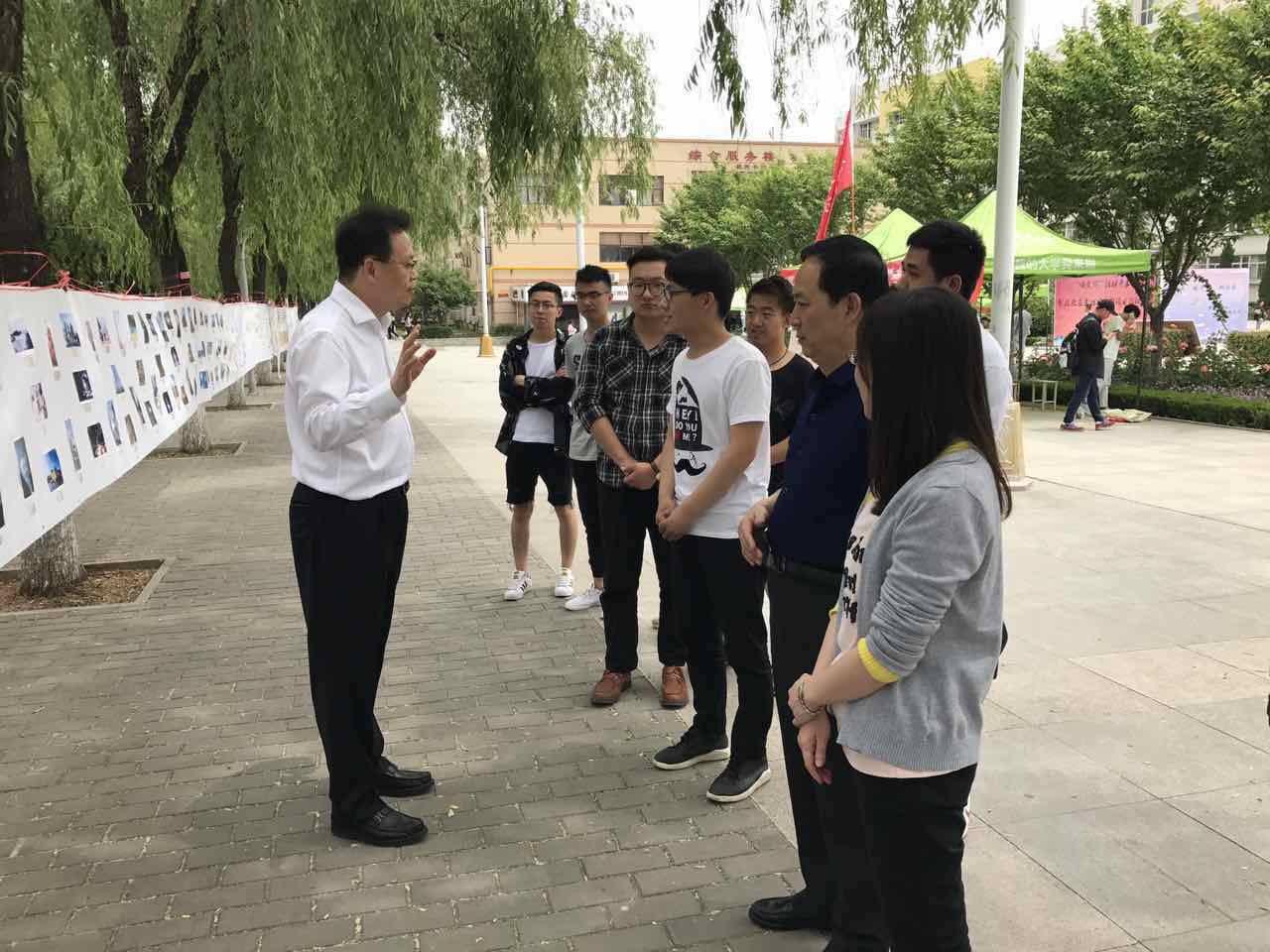 中午,我校理事长姜波、党委书记胡俊生、副校长刘越莲、徐国富等校领导前来现场观看展览,领导们饶有兴致的观看作品,边看边赞扬,并指出:广大学生应该广泛接受高雅艺术的熏陶。参观完作品后,胡俊生书记现场书写“志存高远”、“培桃育李,惠泽群芳”两幅作品赠与此次活动,并现场合影留念。