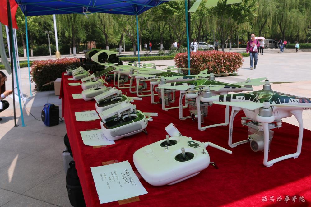 一架架不同性能和造型的无人机,整齐摆放在展台。现场带来了“大疆精灵3”“大疆精灵4”“吾”“御” 等型号无人机,4月27日下午,在学校文化广场,一粟航拍工作室主办第一场培华无人机主题营,并举行了无人机飞行表演。